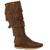 Fun and Comfortable Fringe MoccasinsBy Karen AndersonI ordered these one full size up after reading reviews saying they run small. I'm glad I did. I have a little wiggle room in the toes but the boots fit very well and as they're slender, don't look too big on my feet. The suede is soft and comfy and the 5 layers of fringe are very cool. These have thin soles so you feel the ground--I added some gel insoles for a little more padding. The side zipper keeps the shaft snug on my calves--no slouching. Very happy ... » More Information about Minnetonka Women's Layer Fringe Boot.